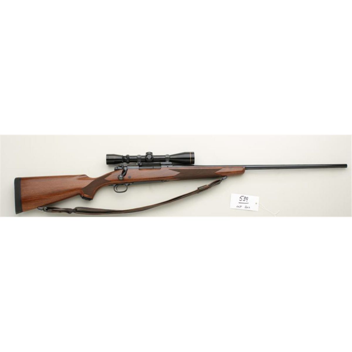 Winchester model 70, Post-64, .338 Win Mag caliber, mounted with Leupold 3x9 power scope on Redfield mounts. Pre-64 type claw extractor and classic sporter markings. Rifle also shows quick detachable sling swivelsand an added thick recoil plate to fit a man over 6’4”. The condition is fine to near excellent showing just some minor use. 98-99%. Dr. Sterling Fenn collection. Est: $700 - $1,400