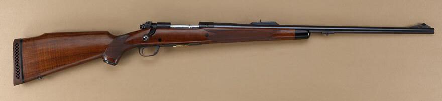 Winchester model 70, Pre-64, .458 Winchester Magnum sporting rifle with custom stock, large gold inlay of black Rhino on floorplate, serial #381450. The rifle shows a factory 25” barrel, factory style rearsight, front sight cover missing. The action shows engine-turning on bolt and follower. The floorplate is matte finished, the rifle is restocked in straight-grain wood with wide checkering that is well cut. The gun ismounted with studs for QD swivels that are not included. A hard-rubber recoil pad is included. The stock measures 13-1/4” to the end of the wood, 14-3/8” to the end of the pad. 98% refinish remains that is wellexecuted. The gun is very good overall, the bore is good and shows some use. From the Robert Petersen collection. Est: $1,750 - $3,500