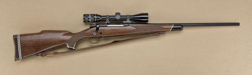 Winchester model 70 XTR .222 Remington caliber bolt-action sporting rifle, nicely custom engraved, mounted with 3x9 power Weatherby Premier scope on Redfield mounts. The stock shows a light refinish andgenerally good overall. The metal surfaces show 98% reblued finish at time of engraving. Stocks show 75% thinning finish and some use. The recoil pad has extended the length to 14-1/2”, the stock measures 13-1/4” to the end of the wood. The bolt has been engine turned, the bore fine to excellent. Serial #G1385992. Shows quick detachable sling swivels and leather sling. From the Robert Petersen collection. Est: $750 - $1,500