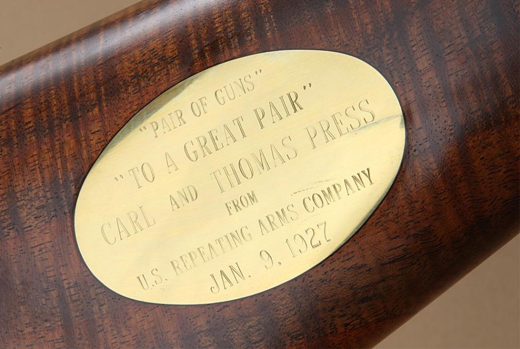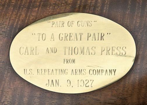 Winchester model 70 XTR Featherweight, .270 caliber, factory presentation, inscribed and presentation grade. Serial #G1779779. The top of the action engraved in block letters, “To Carl E. Press from U. S. R. A. C.” The rifle shows a high polish royal blue finish with select burl wood stocks, fancy checkered in fleur de lis panels, with fancy rosewood cap. Barrel measures 22”, and 43” overall. The action is engine turned and polished. Thecondition is fine to excellent overall, and there is a factory inlaid plaque on right side of the stock inscribed “Pair of guns to a great pair, Carl and Thomas Press, from U. S. Repeating Arms Company, Jan. 9, 1927" (not the manufacture date, but most likely Carl Press’ birthdate). Press was a German industrialist and businessman who purchased a great deal of the factory collection and was for a time their best customer. A number ofhis arms were sold by Butterfields when his collection was dispersed. The rifle is in fine to excellent condition and shows superior quality throughout. From the Robert Petersen collection. Est: $1,500 - $3,000