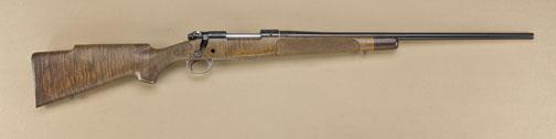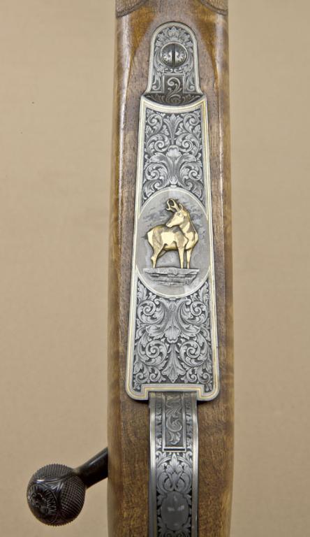 Winchester model 70 XTR Sporter, .25-06 Remington caliber, serial #G1777154. We believe this to be a factory custom workshop special edition which was one of a group made for Carl Press and purchased by RobertPetersen, but no identification on the gun to this effect. The rifle shows a 24” round barrel. The action is nicely engraved with geometrics and scrolls. The floorplate and triggerguard is engraved, high relief goldinlaid, and satin finished. The center portion of the floorplate shows an antelope in gold, surrounded by gold bordered edges. The barrel is gold-banded at breech and muzzle. The gun is stocked in a light colored walnut or maple with flaming grain, fleur de lis checkering, select rosewood cap, steel buttplate with checkered inset wood panel, engraved outline. The engraver’s signature S. Huff-Engr beneath the top buttplate screw(sneaky). The action is factory jeweled as is the follower. The gun is royal blued with high polish finish. The stock is satin finished, the gun is fine to excellent condition, with just slight handling, is near