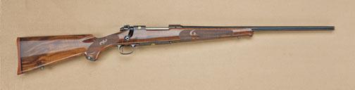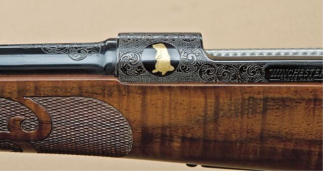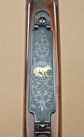 Winchester model 70 XTR featherweight .243 caliber, bolt-action rifle, custom engraved and gold inlaid with fine custom select checkered walnut stock with fancy checkering. Serial #G1578216. The receiver is nicely engraved with scrolls and shows a gold prairie dog on left side and bobcat on right side in flush gold inlay. The floorplate shows the portrait of a fox. The mounts are nicely engraved in scrolls. The stock is beautifully burled walnut with fancy checkering and is beautifully made by a competent custom gunsmith. The rifle shows studs for QD swivels and hard-rubber recoil pad. The action and bolt are nicely engine turned, the bore is good, the rifle shows just a little use. Gold-banded at the muzzle. From the Robert Petersen Collection. Est: $1,000 - $2,000