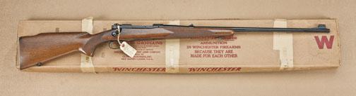 Winchester model 70 pre-64, .300 H&H magnum, bolt-action sporting rifle, standard grade, like new in box, serial #310837. The bolt shows its original tag numbered to the gun. Some original spacers and wrapping, no tag or factory paperwork. Correct box with proper end label and serial number. Box shows some tatters, normal storage and aging. A desirable caliber, hard to find in this near new condition. 99% to new, slight handling only. From the Robert Petersen collection. Est: $1,500 - $3,000