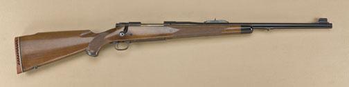 Winchester model 70 super-grade .458 Winchester magnum bolt-action rifle, factory 22” heavy round barrel, African type rear sight, super-grade marked barrel, floorplate, and stock. Serial #719658. The gun is invery good used condition with 90-95% original blue thinning on the edges, some minor erosion and normal aging. The stocks show some dings, mars, scratches, and use and are at least very good. The original Winchesterhard-rubber buttplate is retained. The gun shows mounts for QD sling swivels which are not included. The bolt is factory polished, action good, bore excellent. A classic Model 70 intended for Africa and big game. From the Robert Petersen collection. Est: $1,250 - $2,500