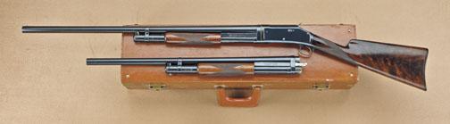 Winchester model 97 12ga pump-action shotgun, factory Black Diamond, with extra barrel, serial $202508. The bolt is factory engraved “Trap Gun” and the stock shows black diamond inlays into select checkered burl walnut stock. The gun shows a 30” full choked barrel and an extra 25” barrel, choked Cylinder, with matching serial number and extra matching forend. The shotgun remains in near fine original condition with 90-95% original blue, thinning at the operating areas and edges, some slight scratches at edge of frame from assembly. The stocks are very good plus to near fine with crisp checkering, some minor handling, normal age. The extra barrel shows 90-95% blue thinning at the edges and operating areas. And an old luggage type case is included. The original buttplate is retained, stock is full factory length. Action is good, bore near excellent. A very desirable and rare model 97 black diamond trap. Est: $3,000 - $6,000