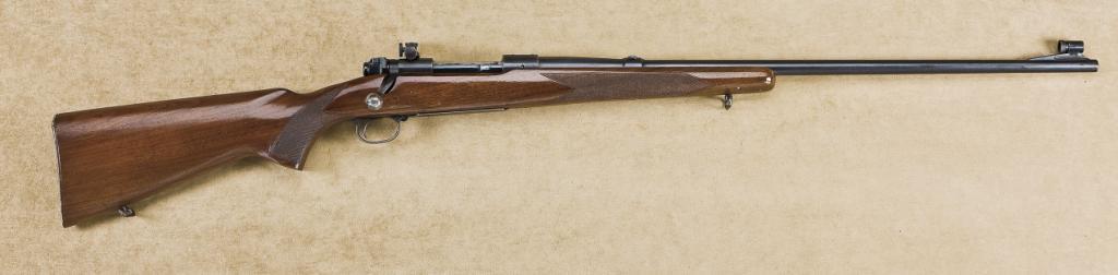 Winchester pre-64 model 70 standard grade, .220 swift caliber, factory 26” barrel, mounted with Lyman type receiver sight, target front sight dovetailed into the original base. The rifle remains in good to very good condition showing 70-80% original thinning blued finish, some erosion and pinprick pitting just starting. The trigger guard shows 70-80% thinning blue. The stocks are good with some minor dings, mars, scratches, and a light application of spray varnish or finish. Sharp checkering and no sanding. The action is good, the bore is near excellent. Est.: $600-$1,200