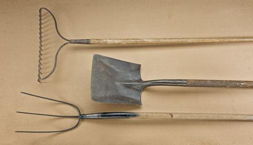 Winchester rake, original shaft, measures approx. 6’. Rake measures 16” across and shows 16 tines. In fair to good condition, some rust, normal aging. Also a Winchester shovel #W62. Shaft shortened slightly. Some rust and normal aging. And a Winchester pitchfork, shows use and repairs, fair only. Est: $150 - $300