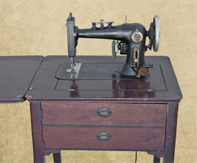 Winchester sewing machine in its original cabinet. Cabinet is early American style and measures approx. 30” in height. Shows Winchester name on each side of the machine, serial #18527. Motor by Universal Motor Company of Racine, WI, type S. Good overall condition. Case has been refinished. Machine good to very good. Est: $2,000 - $4,000