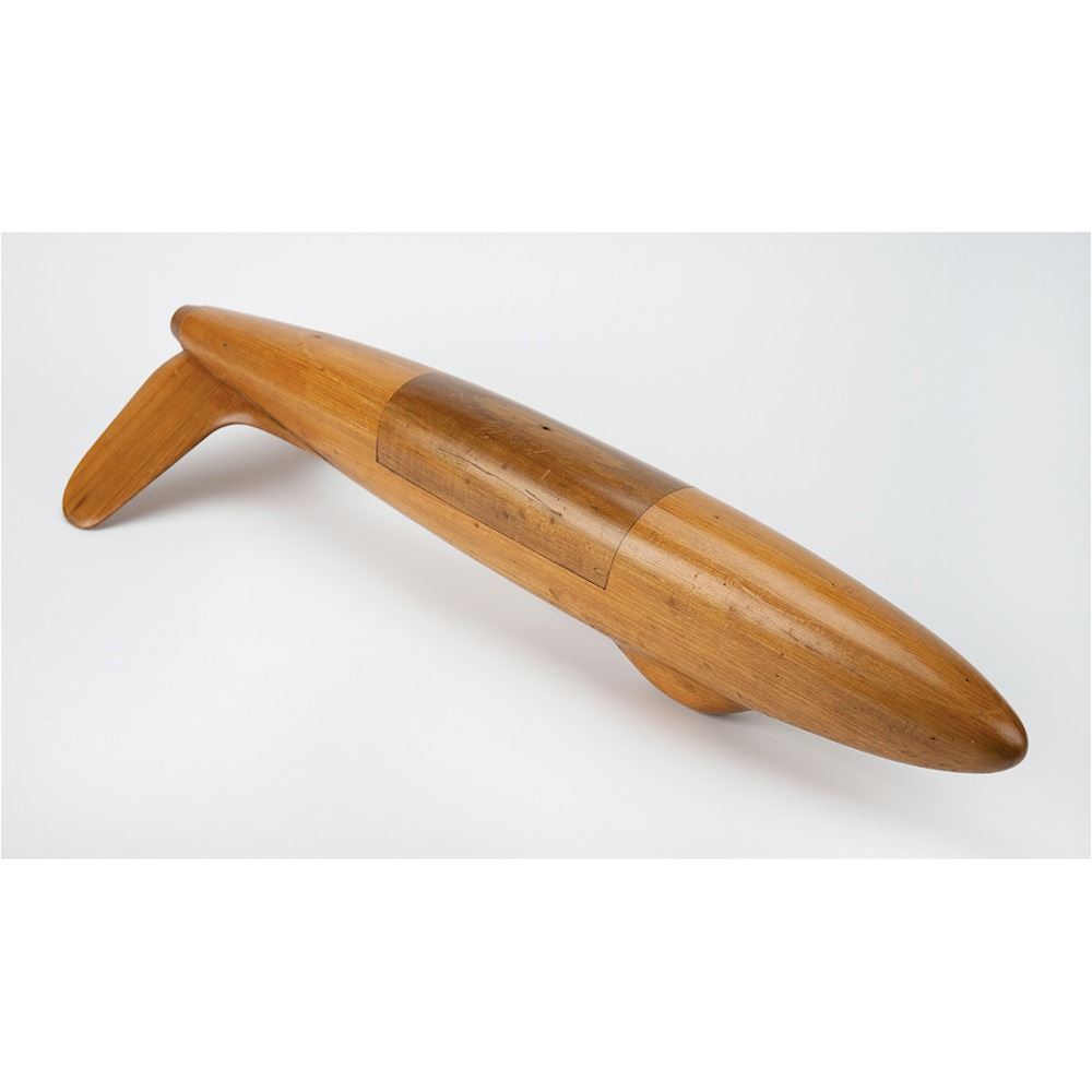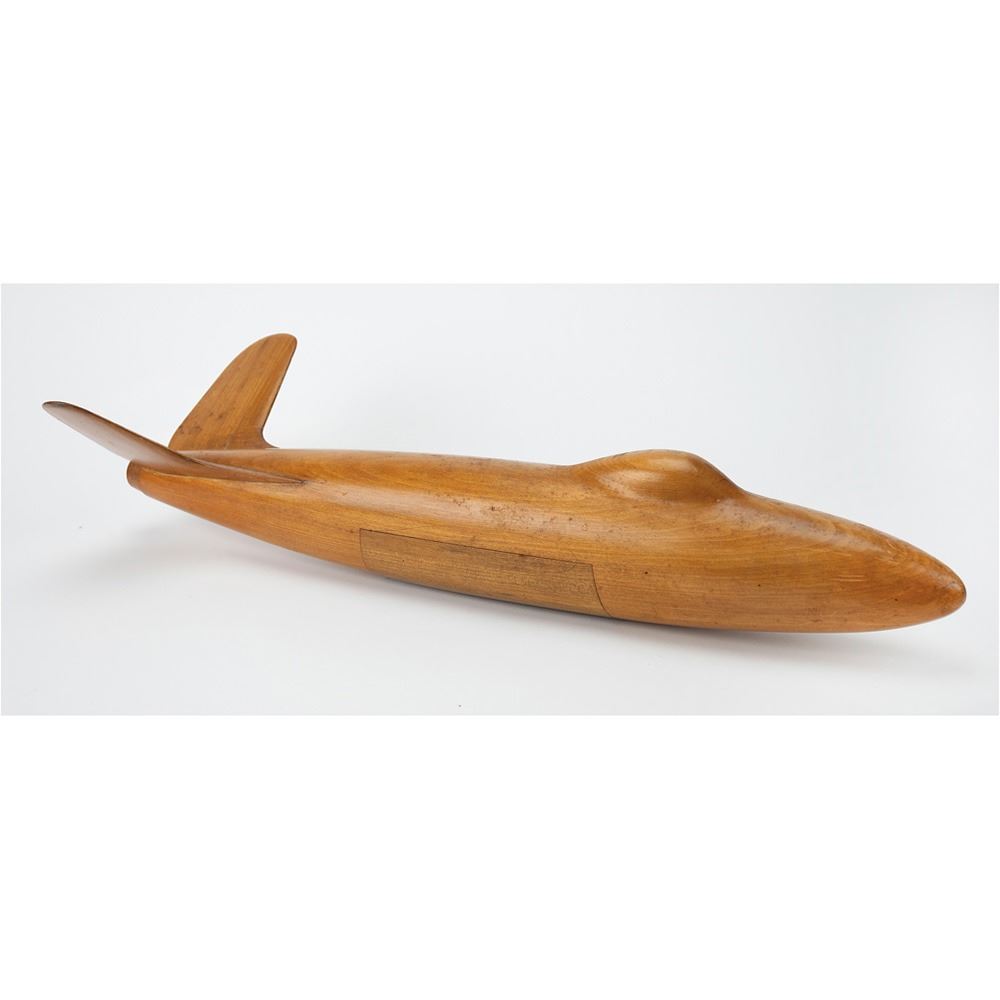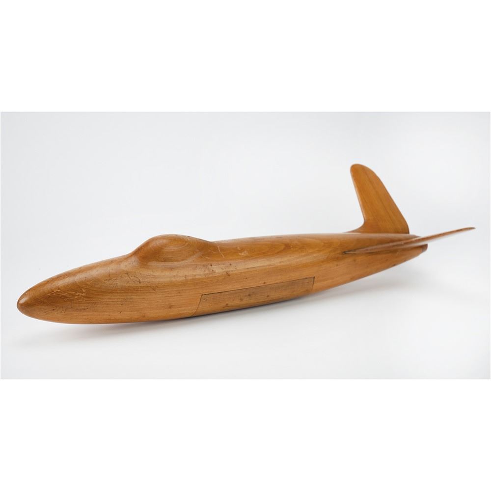 Attractive early wooden wind tunnel jet model, measuring 25˝ in length, with raised cockpit section and two 5˝ long tail fins. In very good to fine condition, with light scratching and surface gouging. Consignor notes that this model was purchased from a former Grumman employee.