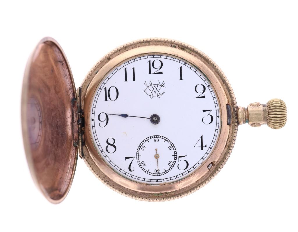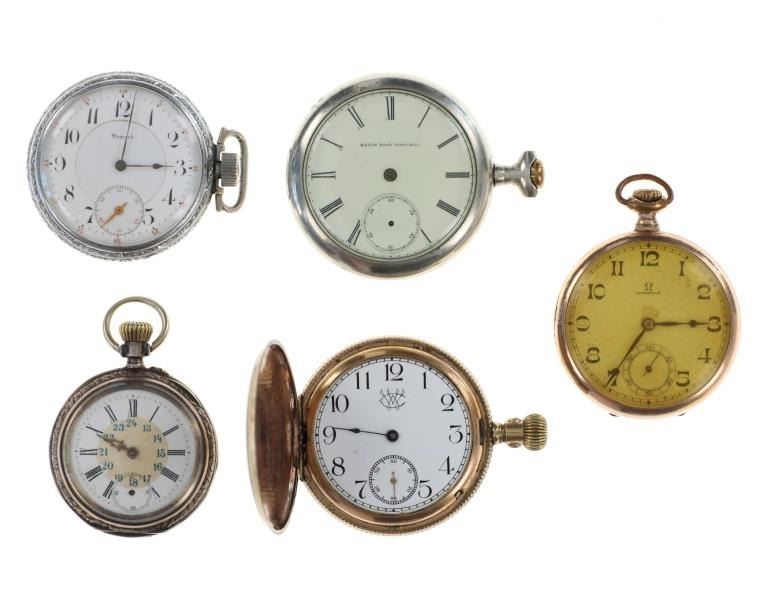 Featured in this lot is this wind up pocket watch collection circa early 1900's. There are five watches in this collection. The first is a Elgin Natl. Watch Co. watch that reads as follows: Elgin Natl. Watch Co. - 2424297 - Safety Pinion - Elgin, Ill. The second is brass pocket watch that shows a floral etching to the front of the case and is marked on the face 'CW'. The next watch is E. Howard Watch Co. watch out of Boston and is marked on the watch as follows: Howard - E. Howard Watch Co. - Adjusted - 19 Jewels - Boston U.S.A. The next is is an Omega pocket watch that is marked as follows: Omega - 15 Jewels - Swiss - 7332940. The last watch is a metal constructed watch that is marked as follows: Cylindrc 6 Rubis - Metal - 91075. The condition of this collection of pocket watches is fair with each watch in this collection not winding up or seized up but otherwise the covers and frames are in fair overall condition. The measurements of these watches range from 2 1/2" x 2" x 3/8" to 2 3/8" x 1 5/8" x 1/2".