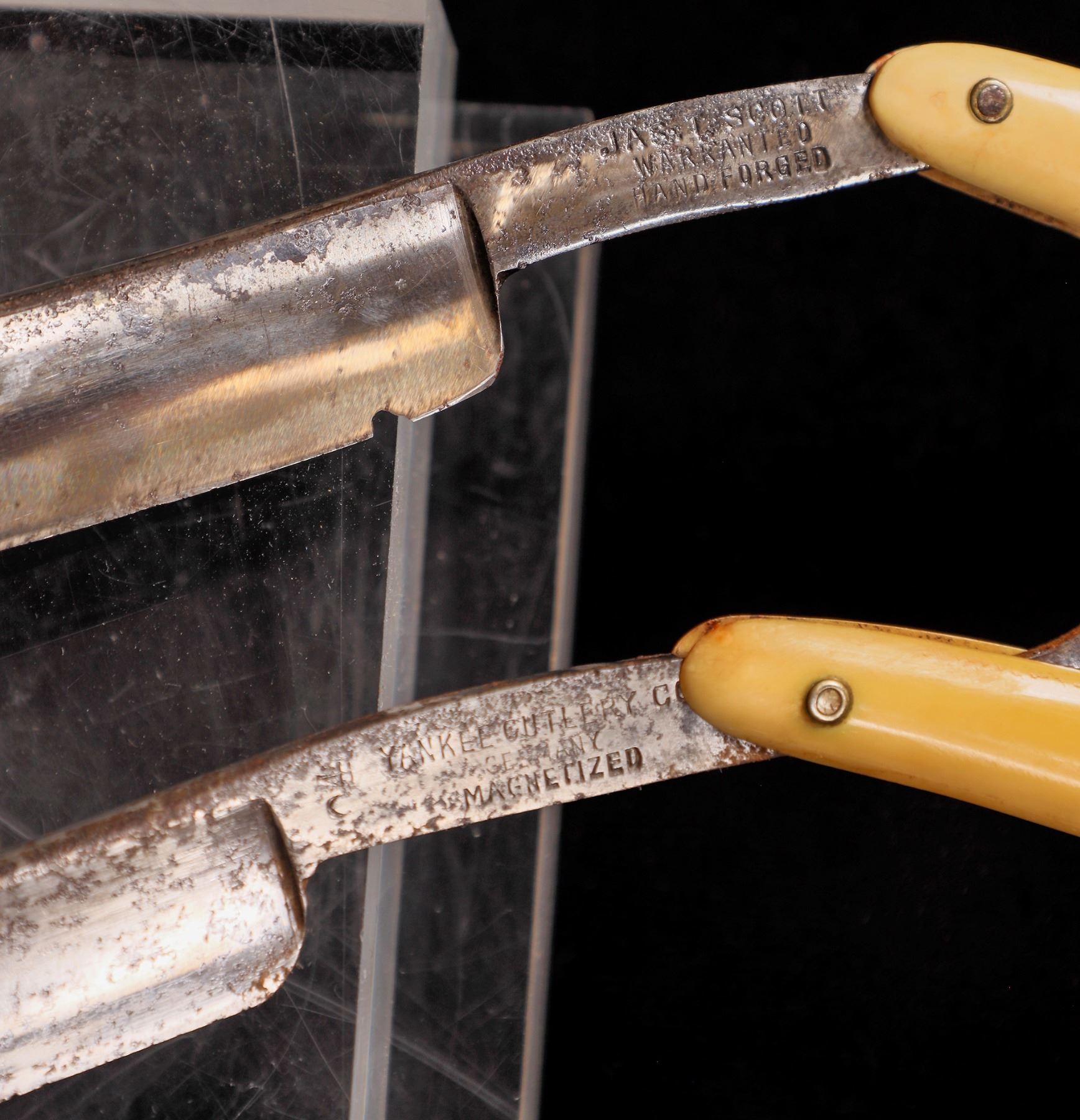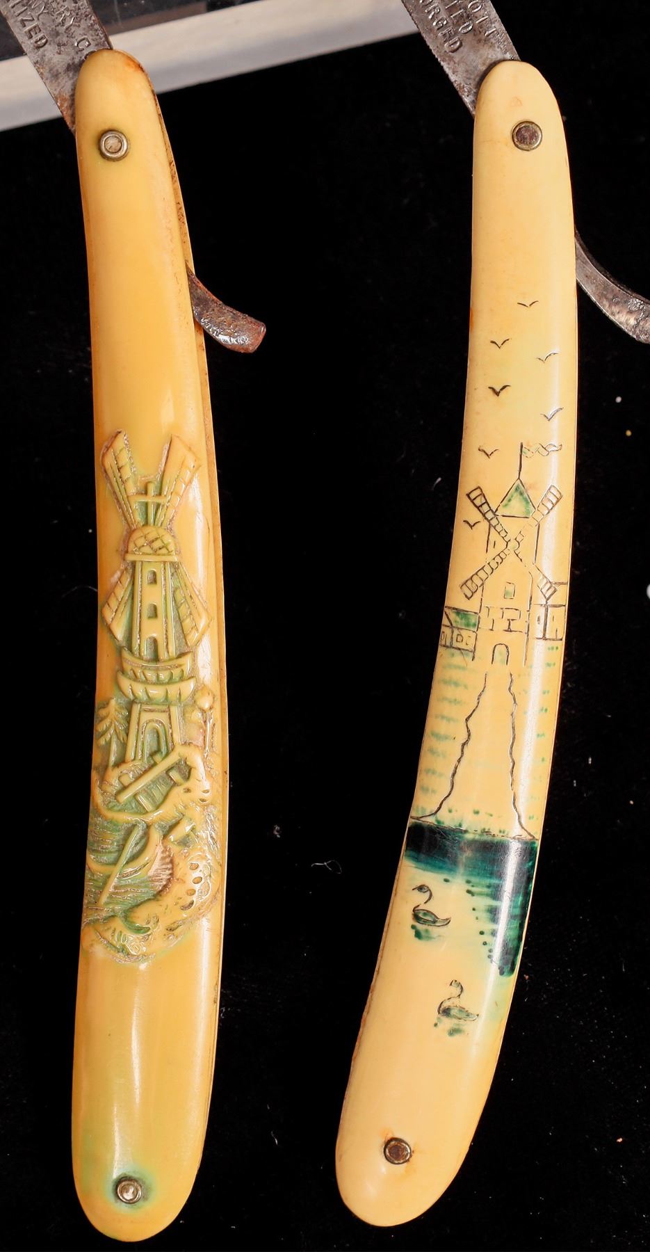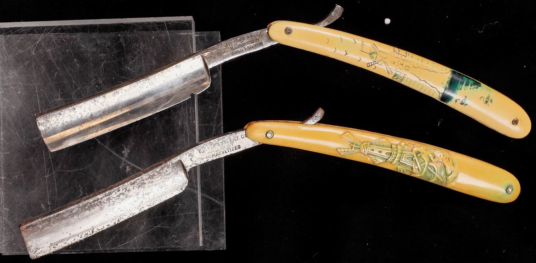 A pair of straight razors with windmills carved on their celluloid scales. One is marked Yankee Cutlery German Magnetized and is full hollow, the second, James Scott, Hand Forged and is a 1/4 hollow. Both are in nice condition. Please see photos for more details. Germany