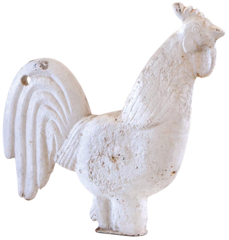 Windmill weight, Rooster, made by Elgin Wind Power & Pump Co.-Elgin, IL, cast iron, VG cond w/old white paint, 17"H x 19"W.