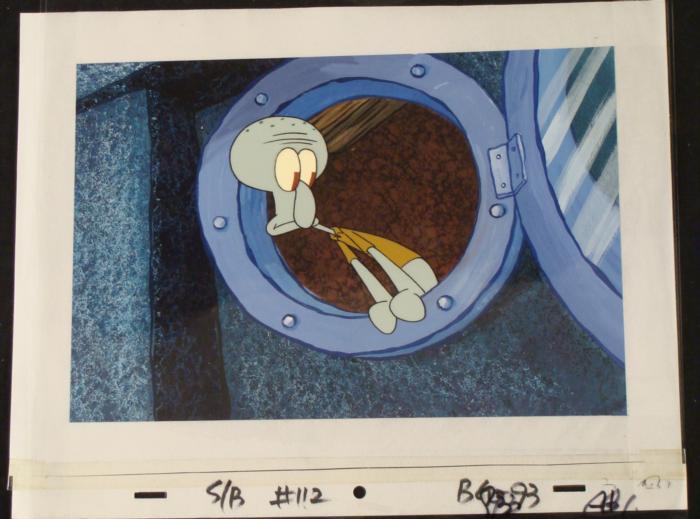 This original hand-painted background and animation cel are from the Nickelodeon TV show SpongeBob Squarepants. The story takes place under the deep blue sea in Bikini Bottom, where SpongeBob resides. SpongeBob, who is a yellow, porous sponge, is your typical happy-go-lucky character, as he is always cheerful and enjoys making people laugh. Patrick Star, SpongeBob's neighbor who is a starfish, is your average children's show idiot, as he boasts knowing nothing and is often getting himself into ridiculous situations. Between the homes of these two lies the home of the miserable Squidward, a squid, who is known for being grouchy and playing tricks on SpongeBob and Patrick. Both SpongeBob and Squidward work at the Krusty Krab, a fast food business run by the greedy money-loving Mr. Krabs, a crab, the arch rival of the evil, possibly misunderstood, Plankton. Another neighbor, Sandy Cheeks, an athletic squirrel who normally wears an astronaut's space suit, was introduced in "Tea at the Treedome." She spends most of her time inventing and experimenting. Squidward is looking out his window.Original Production Background and Animated Cel Overall Size of Background: 10 1/2" x 17" Overall Size of the Cel: 10 1/2" x 12 1/2" Very good conditionThis is an original hand-painted cel set-up used in the production of an episode of "SpongeBob SquarePants." Each one-of-a-kind set-up represents a slight change in position of the characters. When individually photographed and projected in rapid succession, the images appear to move.