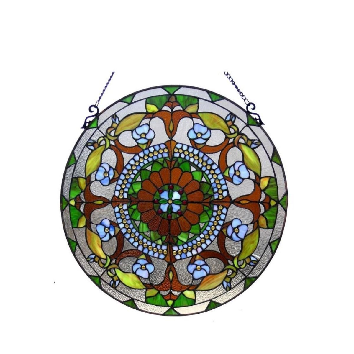 "VIOLETTA" Tiffany-glass Victorian Window Panel 24" This handcrafted Tiffany style Victorian design window panel will brighten up any room. The beautiful amber, green, and blue will add color and beauty to any setting. Made from 494 pieces of individually hand cut copper-foiled stained glass and 68 beads. Includes attached hooks and 28 inches of chain for easy installation. Overall Width (in)24.00 Overall Height (in)24.00 Max Hanging Distance (in)33.00 Net Weight (lbs)5.00 Panel Chain Length (in)28.00 Pane Shape Round Glass Type Tiffany-glass Glass Thickness (in)0.12 Est. Glass Cuts494.00 Est. Glass Beads68.00 Finish Antique Brass Overall Materials Glass & copper frame Specific Uses Indoor