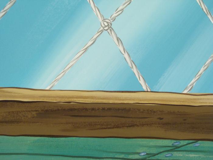 This original hand-painted background from the Nickelodeon TV show SpongeBob Squarepants. The story takes place under the deep blue sea in Bikini Bottom, where SpongeBob resides. SpongeBob, who is a yellow, porous sponge, is your typical happy-go-lucky character, as he is always cheerful and enjoys making people laugh. Patrick Star, SpongeBob's neighbor who is a starfish, is your average children's show idiot, as he boasts knowing nothing and is often getting himself into ridiculous situations. Between the homes of these two lies the home of the miserable Squidward, a squid, who is known for being grouchy and playing tricks on SpongeBob and Patrick. Both SpongeBob and Squidward work at the Krusty Krab, a fast food business run by the greedy money-loving Mr. Krabs, a crab, the arch rival of the evil, possibly misunderstood, Plankton. Another neighbor, Sandy Cheeks, an athletic squirrel who normally wears an astronaut's space suit, was introduced in "Tea at the Treedome." She spends most of her time inventing and experimenting. It seems to be the windows in the Krusty KrabOriginal Production Background Overall Size of Background: 10 1/2" x 13 3/4" Very good conditionOriginal Production Backgrounds are used in the making of the final version of animated productions. The background establishes the location and the overall good mood of the scenee. Typically, a background layout artist creates a drawing to establish the content of the scene, placement of characters, perspective and camera angle. Based on this drawing, the background artist creates a preliminary painting to confirm all of the scenes details, then the final production background which is used in the filming of the scene. When these backgrounds are individually photographed behind the progression of production cels, and projected at a rapid succession, the images in the foreground appear to move, creating an animated scene. The background is ready to be matted and framed. It is a colored background with the animator's notations at the bottom.