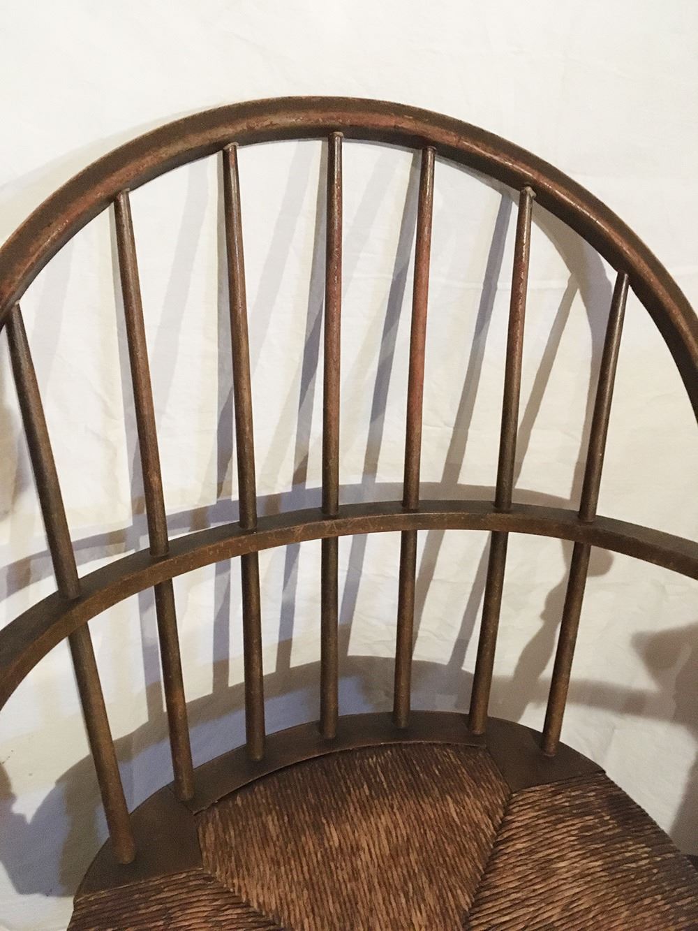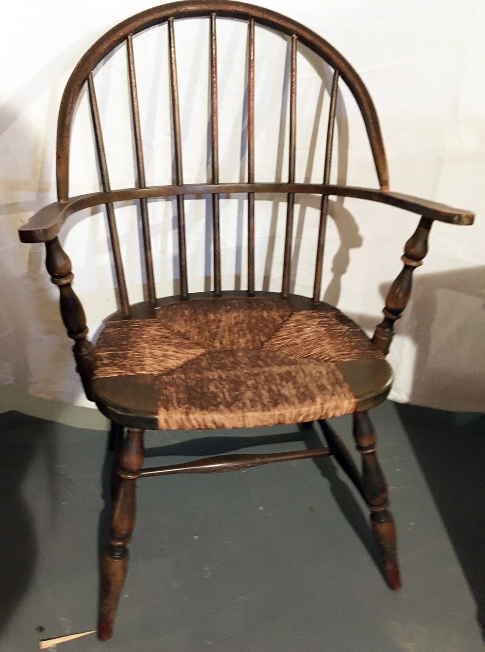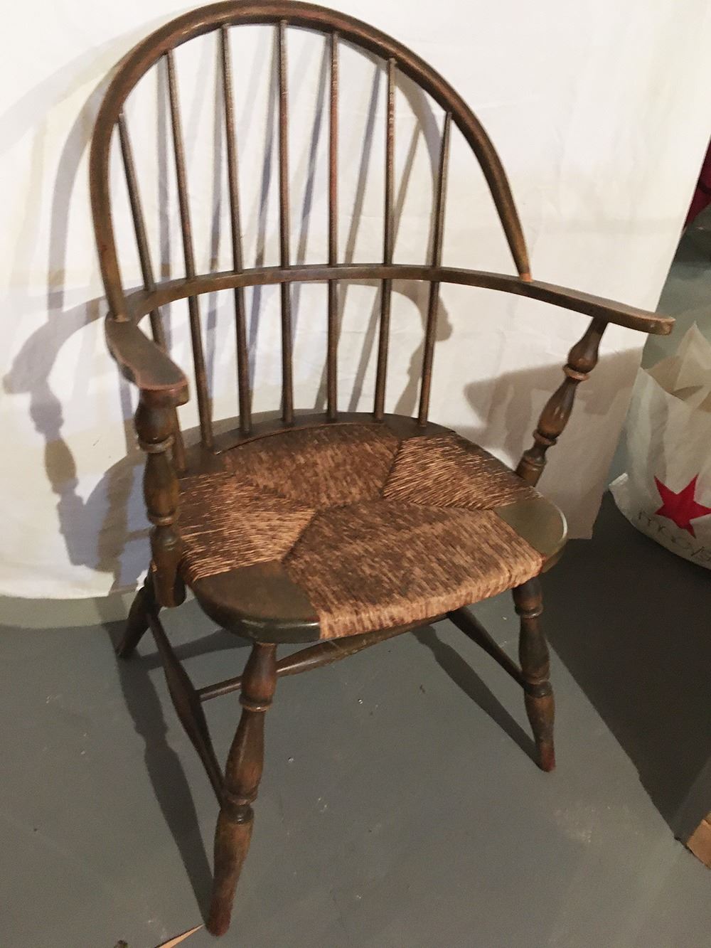 Vintage Windsor chair with rush seat measures approx. 25 inches x 17 inches x 37 inches.