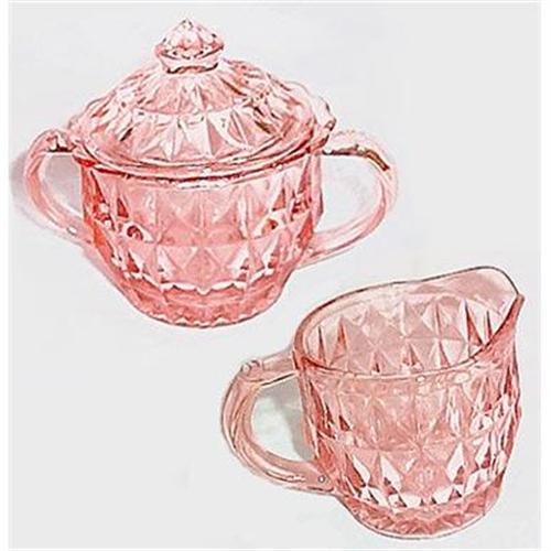 Jeannette produced their Windsor Diamond pattern during the years 1936-1946. This lovely Art Deco pattern features myriads of beveled glass triangles pressed to form diamond that combine for brilliant optic display in sunshine or bright light. We have on this auction their pink Depression glass sugar bowl, complete with lid, and creamer set. All three pieces are in excellent condition. - We have a matching pink Windsor Diamond butter dish for sale in a separate auction