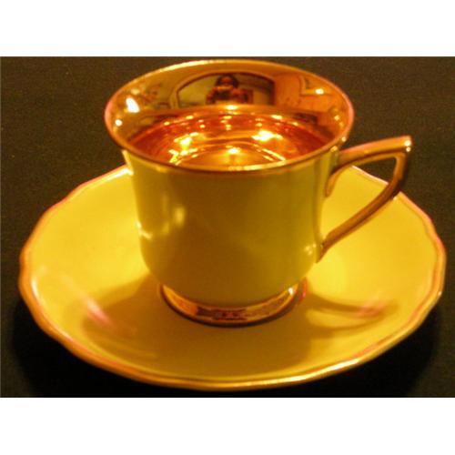Lemon-colored footed demitasse stands at just a little more than 2 inches tall. Almost 2.5 inches in diameter at rim. Saucer measures about 4.5 inches in diameter. Interior of teacup is gilt, also handle and foot, and rim of saucer.