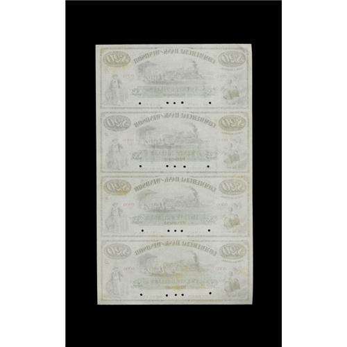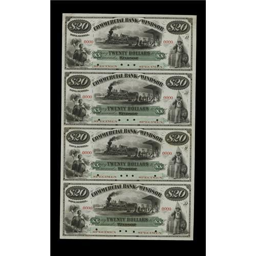 <B>Windsor, NS- Commercial Bank of Windsor</B></I> $20-$20-$20-$20 186_ Ch. 195-10-02S Uncut Specimen Sheet.<BR>This is a unique uncut specimen sheet on this bank that is mentioned in Charlton. Each uniface note has serial number 0000 and is punch cancelled through the signature block areas. The sheet also has a red overprint of "SPECIMEN" on all four notes. This attractive green and white sheet was part of the 1990 auction of the ABNCo archives. Only corner folds keep this well margined sheet from a higher grade. <B>Choice About Uncirculated.</B></I><BR><I>From The Collection of Richard A. Beck</B></I>