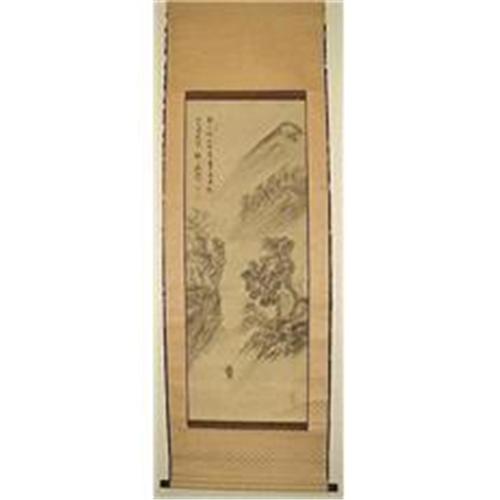 Einstein was right! Space and time do curve, or at least they do in this remarkable painting by Senzan Shiryu. The wind seems to curve the landscape and time itself in the most wondrous manner. Look especially at the second photo here to see close up the effect of Shiryu's masterful curving brushwork. Mount: 72 x 22.5 inches, 177.5 x 57 cm. Painting: 44 x 16.5 inches, 111.5 x 42 cm