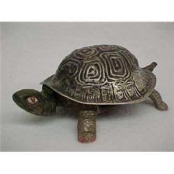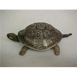 Windup silver and metal turtle with bell, English silver shell on turtle, hallmarked GY & Co., Chester 1912 - 13 (push head or tail down to ring bell), 5 1/2" from head to tail