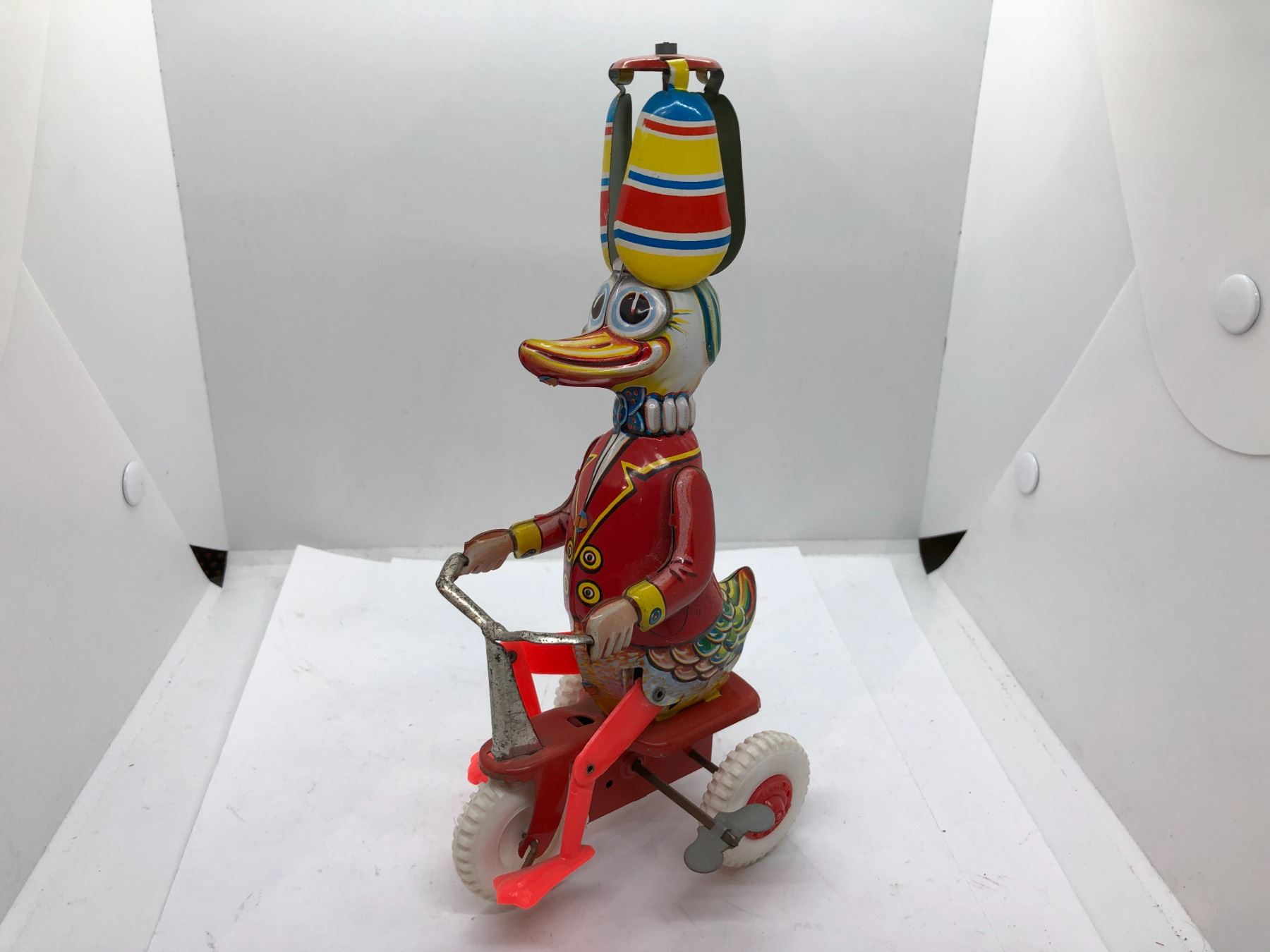 Windup tin lithograph toy duck on tricycle made in West Germany