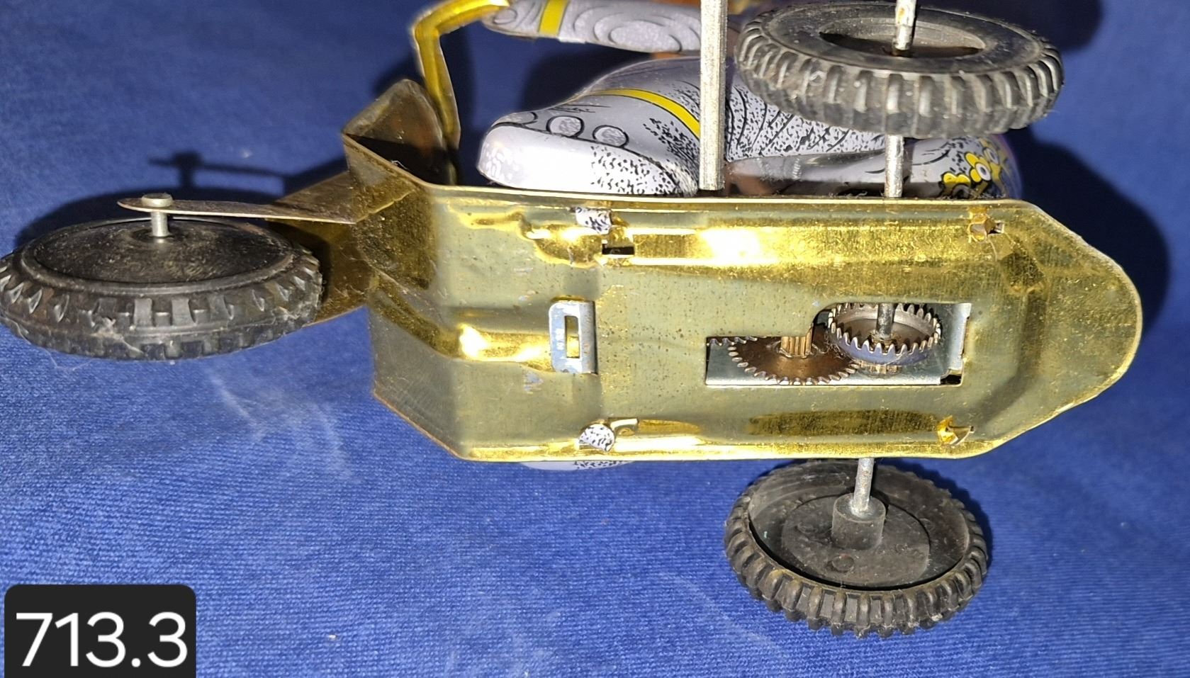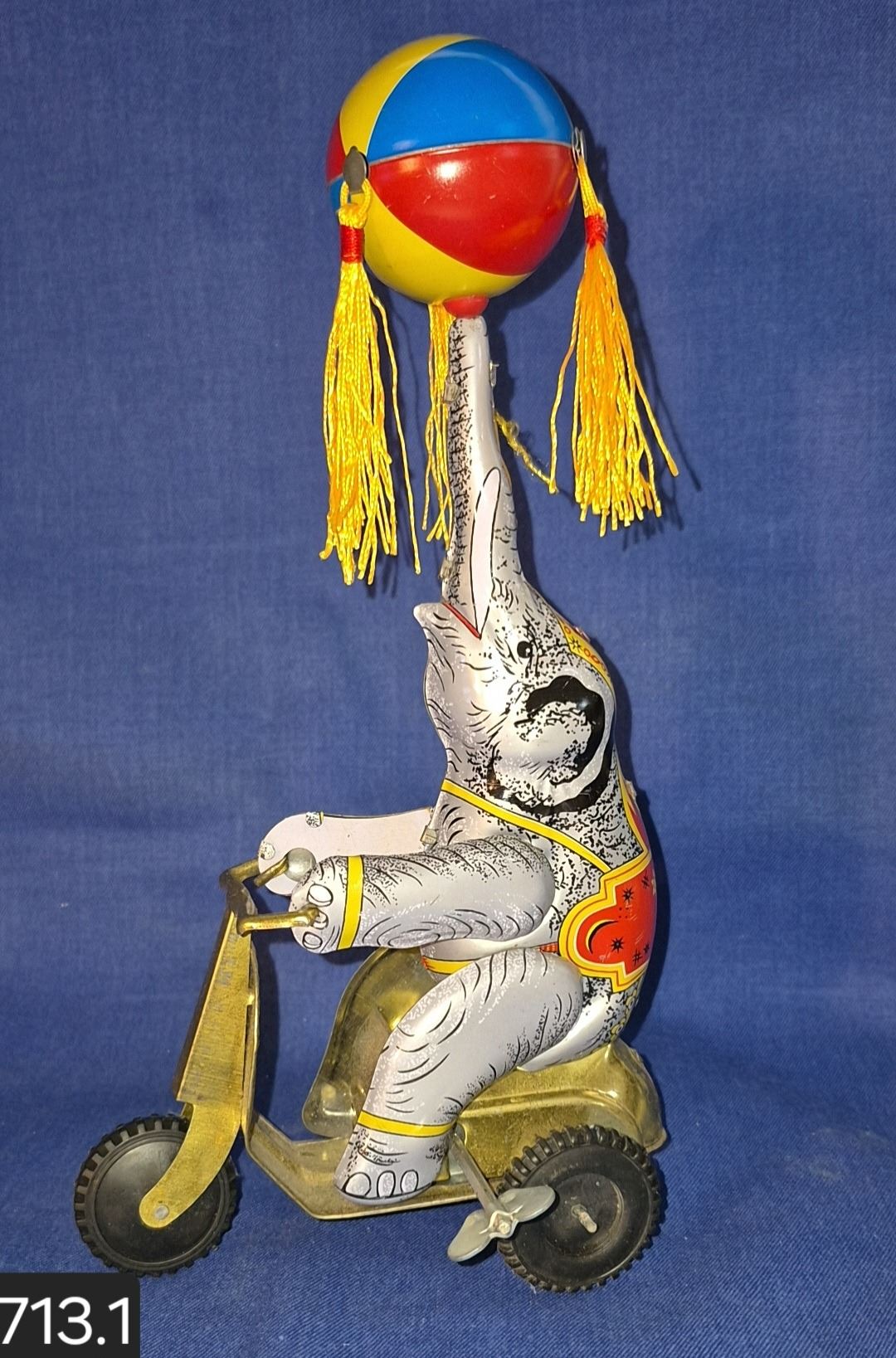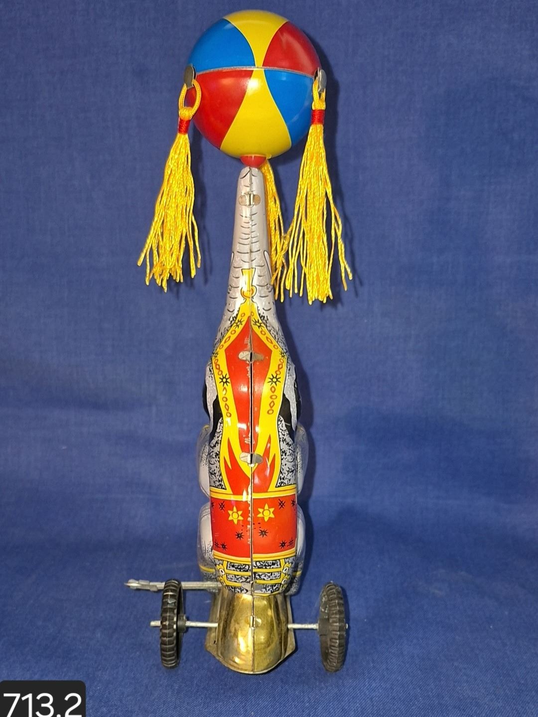 Windup tin lithographed Shylling circus elephant toy - works, drives while top rotates