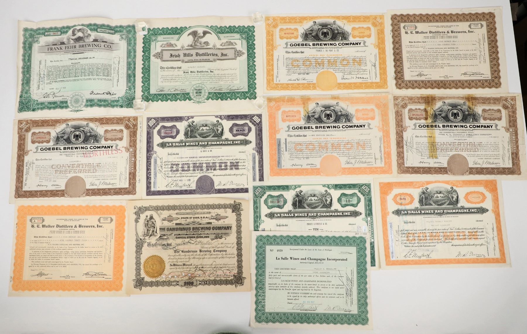 Lot of lot of 13. I/C, I/U. Issued 1900-63. Fair or better. I.E.; Frank Fehr Brewing Co. , La Salle Wines and Champagne, Inc. , Goebel Brewing Co. , H.E. Walker Distillers & Brewers, Inc. and nine others.