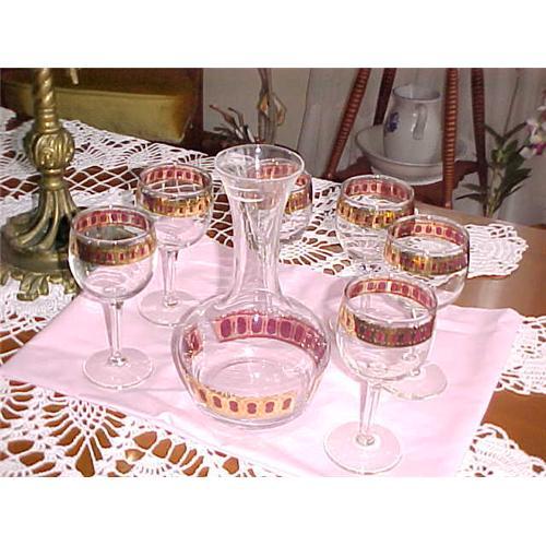 Wine Caraffe and 6 stem 4 oz. wines 6" tall ; wide gold band with lrg. ruby or cranberry dbl. dots all around inside gold band, 8.5" caraffe with same design around base. Beautiful; ready for your use.