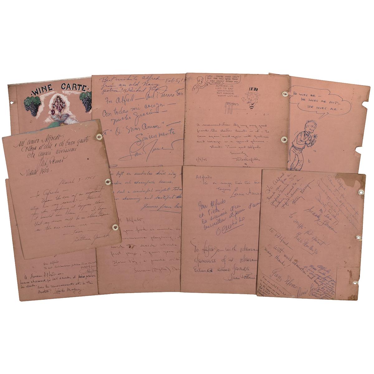 Ten 9.5 x 12 hand-painted wine lists or wine list covers from Pierre’s Restaurant in New York City, each signed and inscribed on the reverse by at least one of thirty total celebrities. Signers include: Richard Nixon, Lana Turner, Greer Garson, Robert Cummings, George McManus (adding a sketch of Jiggs), Keenan Wynn, Lucien Ballard, Winthrop and Barbara Sears Rockefeller, Wally Bishop (adding a large sketch), Polly Bergen, Susan Douglas Rubes, Luise Rainer, Merle Oberon, Lawrence Tibbett, and Leonide Moguy. In overall very good to fine condition with mild handling wear and scattered soiling. Accompanied by a 1944 TLS to the restaurant owner from Greer Garson signed Greer Garson Ney, a photo of Garson with a facsimile signature, and a color photo of one of the restaurant owners.