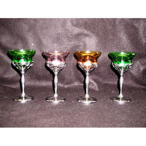 Set of 4 decorative wine glasses in beautiful tones of green,lavender and topaz are made by Faberwear. The decorative stems and openwork holder is made of stainless steel for easy care. Weighted to avoid accidents and in excellent condition. Measure 6H X 3 1/8in. W.