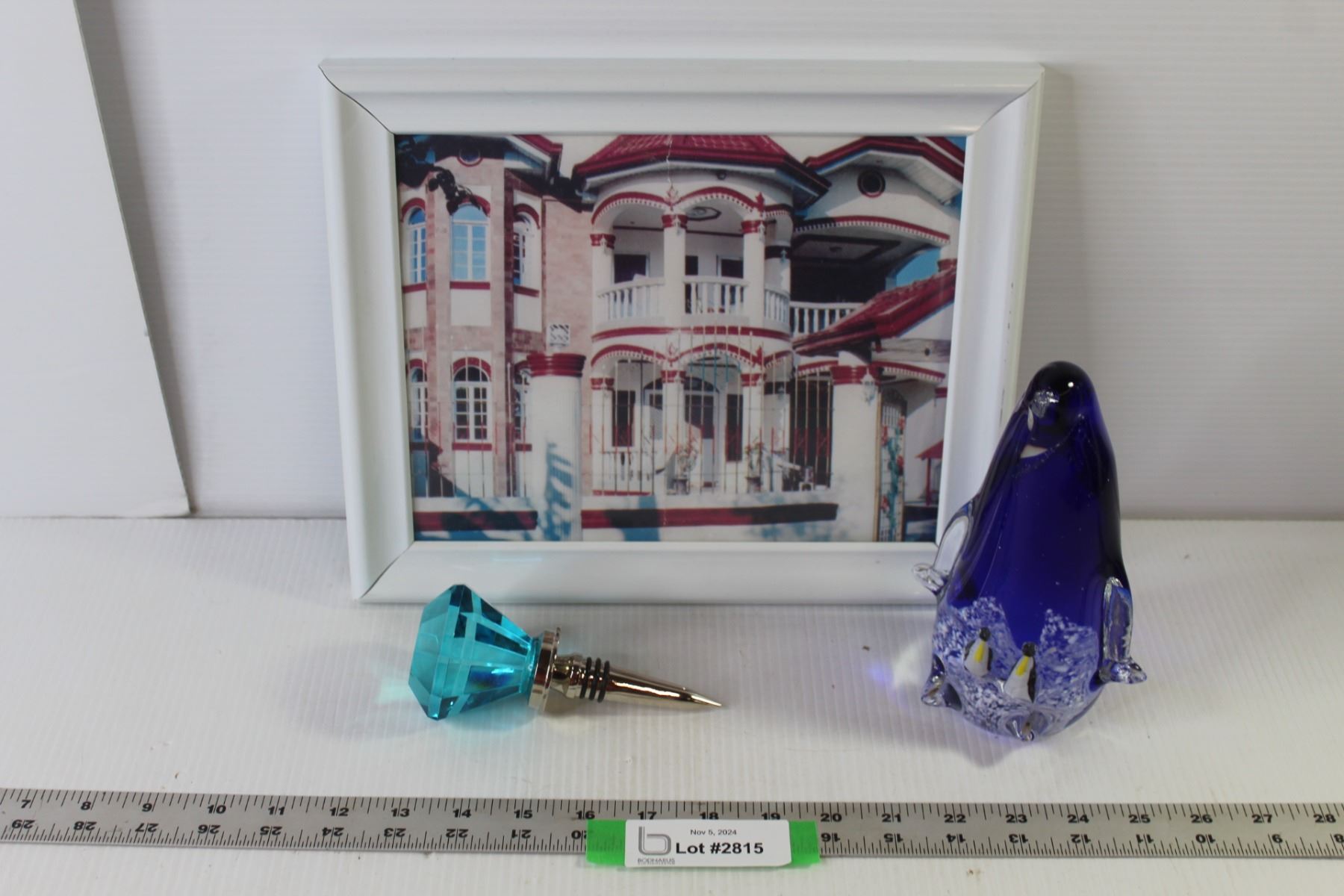 Wine Stopper 5", Glass Penguin Ornament 7" Tall (Broken Beak), Framed Picture 12" x 10"