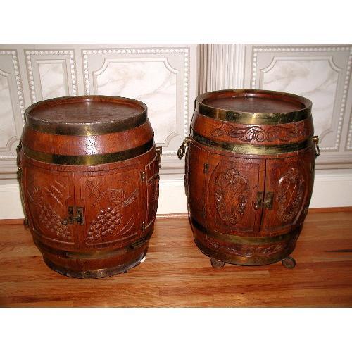Pair of mid 19th century English oak authentic wine barrels with brass adjustable strappings or bands,brass handles,hinges and latches cone from England. The pair are the same size with different carving and can be used as side tables or wonderful on a counter as a wine rack. Grape leaf carving on the front doors of one with grape vine and leaves scrolling along the center on other three sides. The interior is painted green and houses a metal manual revolving wine rack or holder for 6 large bottles. A light in the center which we have adapted to American currency. Works wonderfully. The other with shield or crest design around the exterior has a green metal wine rack which revolves for 2 large bottles,4 smaller with a trough in the center for corkscrew,etc. The interior of doors covered in green fuzzy felt with 4 hangers for glasses attached. One broken off. Tjhe papr are on wheels for ease in moving. Wonderful aged wood,excellent condition with one darker spot on top of shield design barrel where a lamp or the like sat for many years. The bands are darker in some areas from age and wear yet gives an aged,rustic look. Measure 18L with handles,18W with latch and 23.5H each.