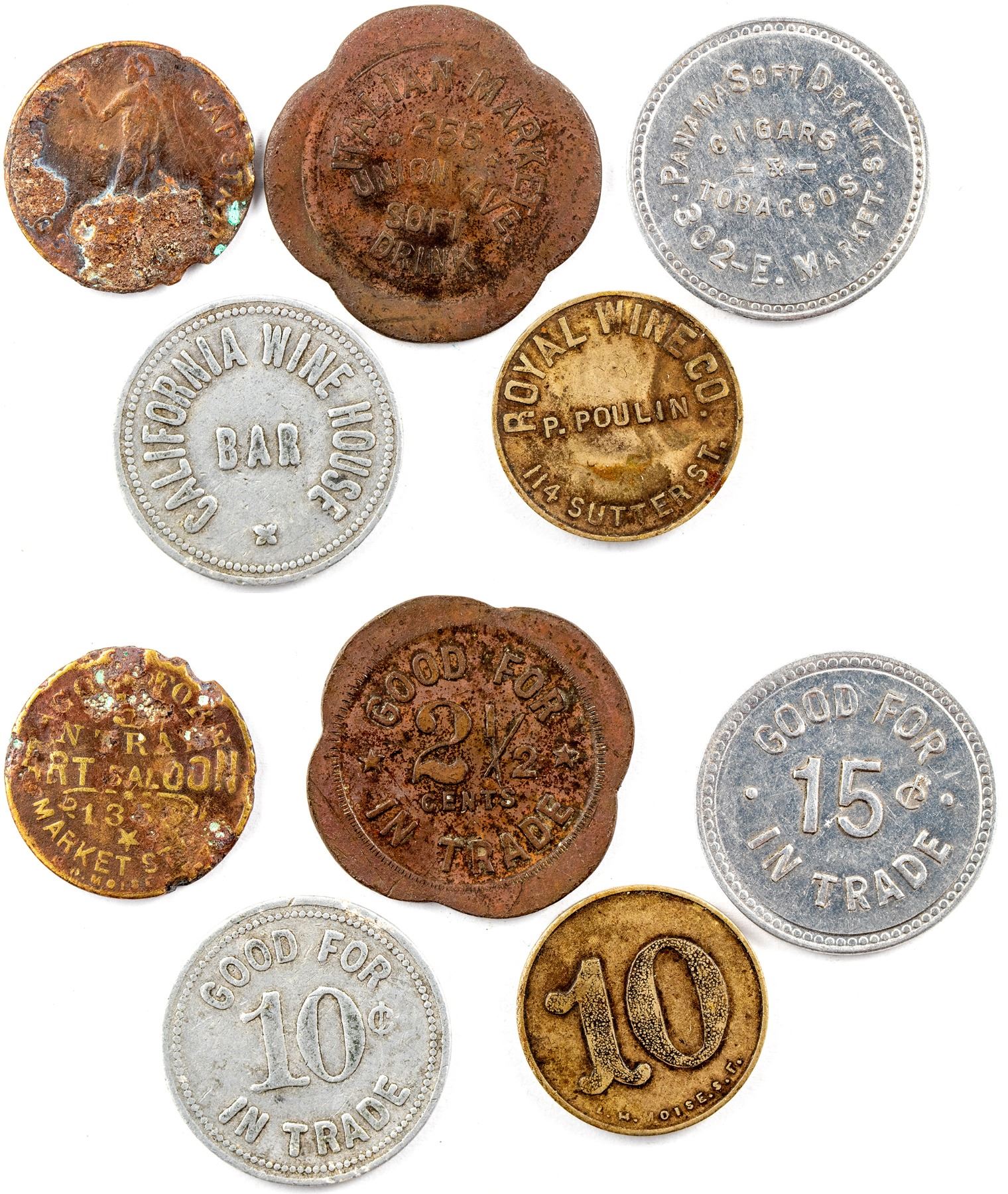 Lot of five San Francisco tokens: Art Saloon; California Wine House Bar; Italian Market Soft Drink; Panama Soft Drinks; Royal Wine Co. Ex: Ron Lerch collection.