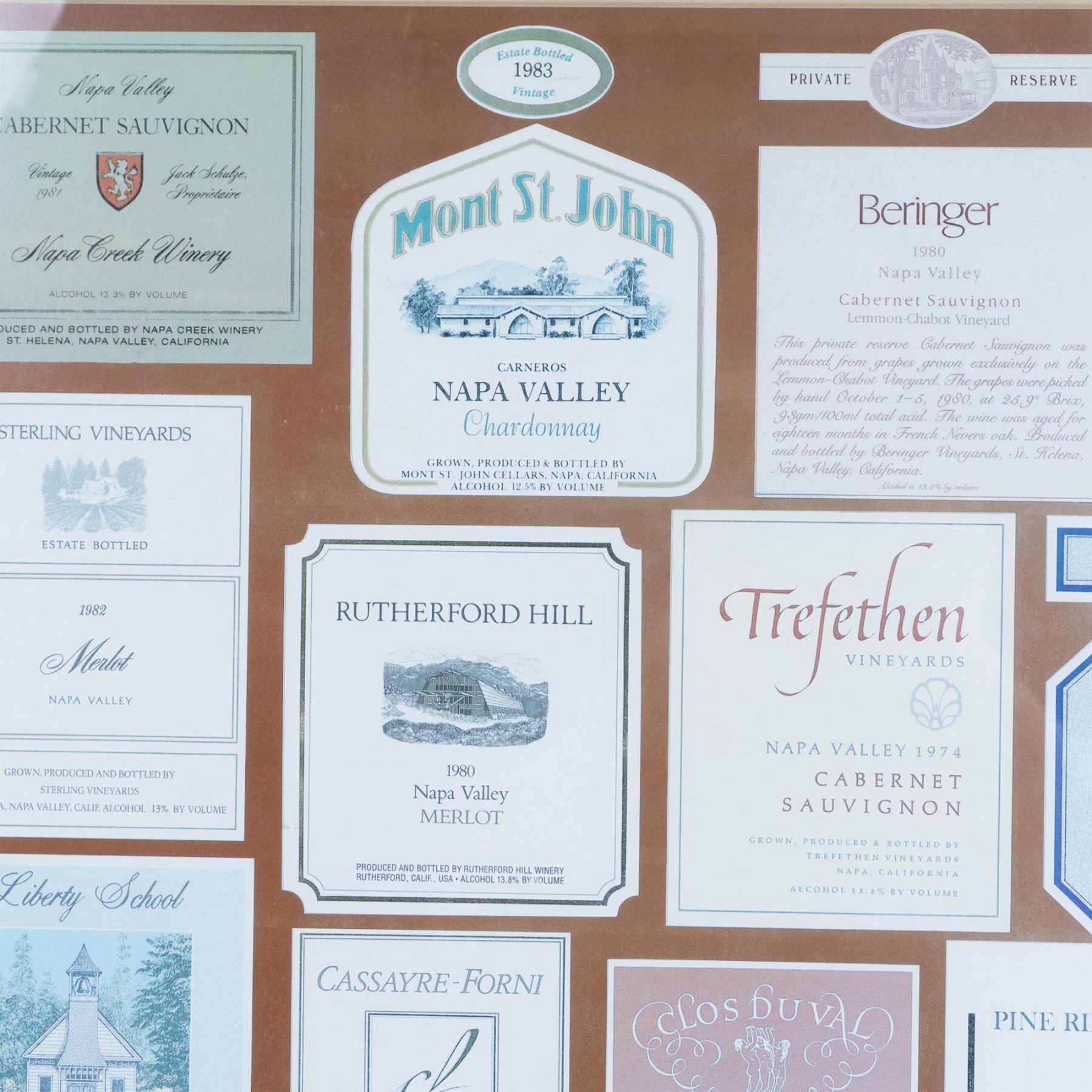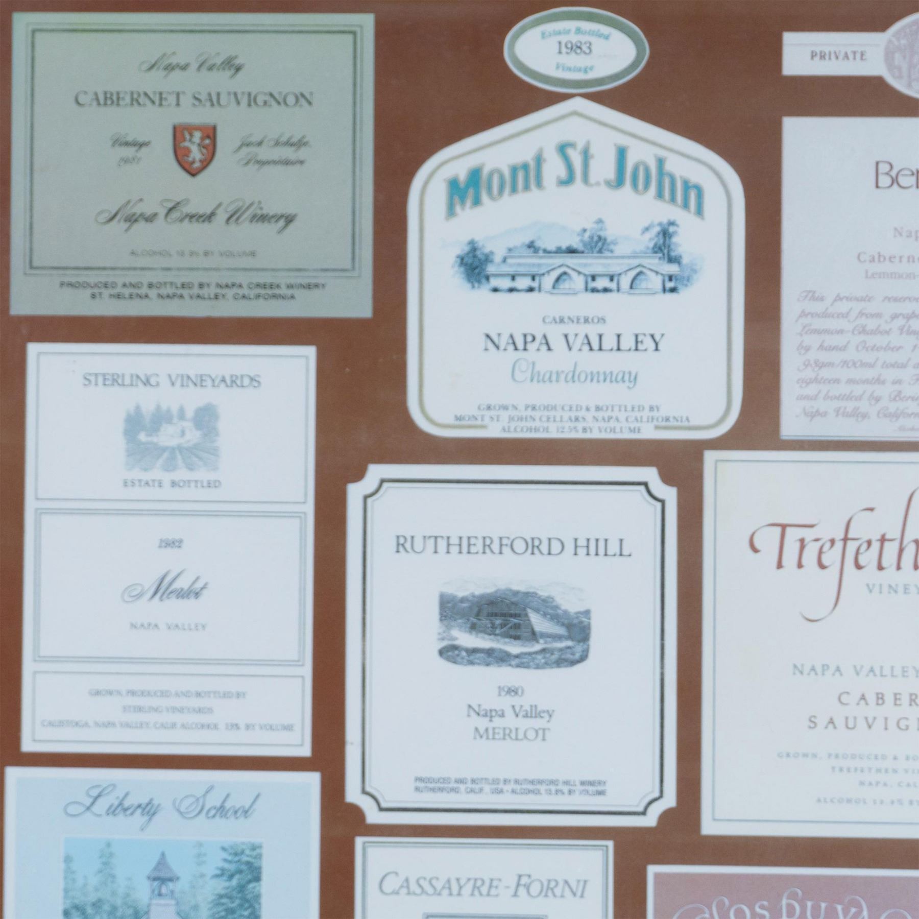 A lovely framed poster exhibiting 18 vintage Napa Valley wine labels. Housed in a rose gold-colored frame with a beige mat. Poster sight size: 18.75"L x 25"H. Frame dimensions: 24"L x 0.75"W x 30.25"H.