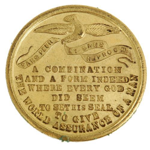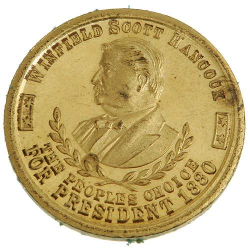 <B>Winfield Hancock 1880 Campaign Token,</B></I> gilt, 28mm, obverse with a bust of Hancock centered and major general straps on each side, above, WINFIELD SCOTT HANCOCK, below, THE PEOPLES CHOICE/ FOR PRESIDENT 1880; reverse above, an eagle in flight with a riband reading, SANS PER ET SANS REPROCH, below, A COMBINATION/ AND A FORM INDEED/ WHERE EVERY GOD/ DID SEEM/ TO SET HIS SEAL/ TO GIVE/ THE WORLD ASSURANCE OF A MAN. Choice condition with most of original luster. <BR><BR><b>Shipping:</b> Requires 3rd Party Shipping (<a target="_blank" href="http://www.heritageauctions.com/common/shipping.php">view shipping information</a>)