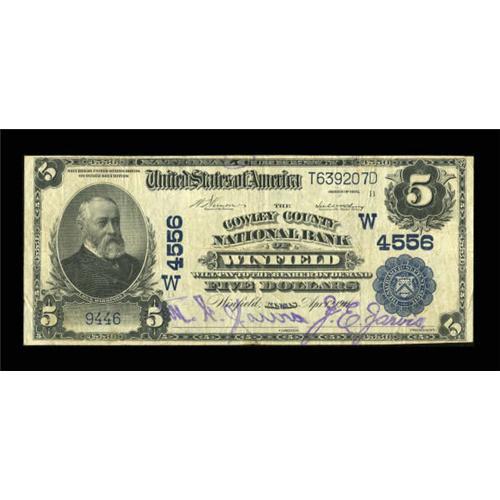 <B>Winfield, KS</B></I> - $5 1902 Plain Back Fr. 601 <B>The Cowley County NB</B></I> Ch. # (W)4556<BR> Large notes only from this scarcer family operated Winfield bank. Nice <B>Fine+++,</B></I> with bold violet signatures of M.I. Jarvis and J.E. Jarvis. <BR><BR><b>Shipping:</b> Coins & Currency (<a target="_blank" href="http://www.heritageauctions.com/common/shipping.php">view shipping information</a>)