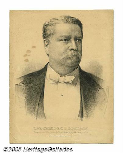 <B>Winfield Scott Hancock Campaign Print</B></I> 11" x 14" lithograph by J. H. Bufford's Sons of Boston, titled "Gen. Winfield S. Hancock. Democratic Nominee for President of the United States." Hancock was a much better general than his opponent, James Garfield, but lacked political skills. He still came close to being elected. This scarce print is in fine condition, with light even toning and four minor stains, clustered in the background. Lot:259