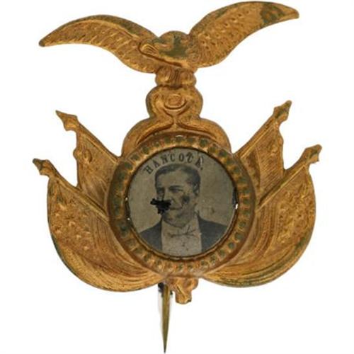 <B>Winfield Scott Hancock Fancy 1880 Ferrotype Pin.</B></I> Full luster on the brass shell frame. For strictest accuracy we note a trivial surface emulsion imperfection where Hancock's left shoulder joins the rim, but it is of no consequence. And a large blemish near the face of the candidate does mar its otherwise minty condition look. A gorgeous example for a very tough candidate. Measures 40mm x 30mm. <BR><BR><b>Shipping:</b> Miscellaneous Collectibles, Smal (<a target="_blank" href="http://www.heritageauctions.com/common/shipping.php">view shipping information</a>)