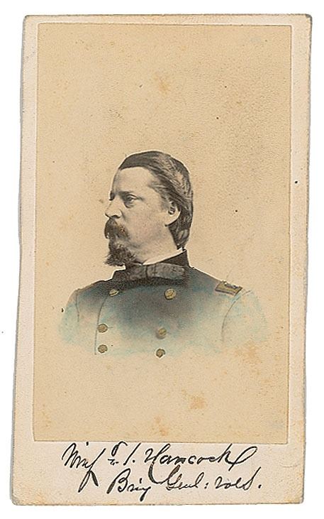 Unique hand-tinted 2.5 x 4.25 carte-de-visite photo of Hancock in uniform by R. W. Addis, boldly signed on the mount in ink, "Winf'd S. Hancock, Brig. Genl: Vols." In fine condition, with a hint of light foxing.