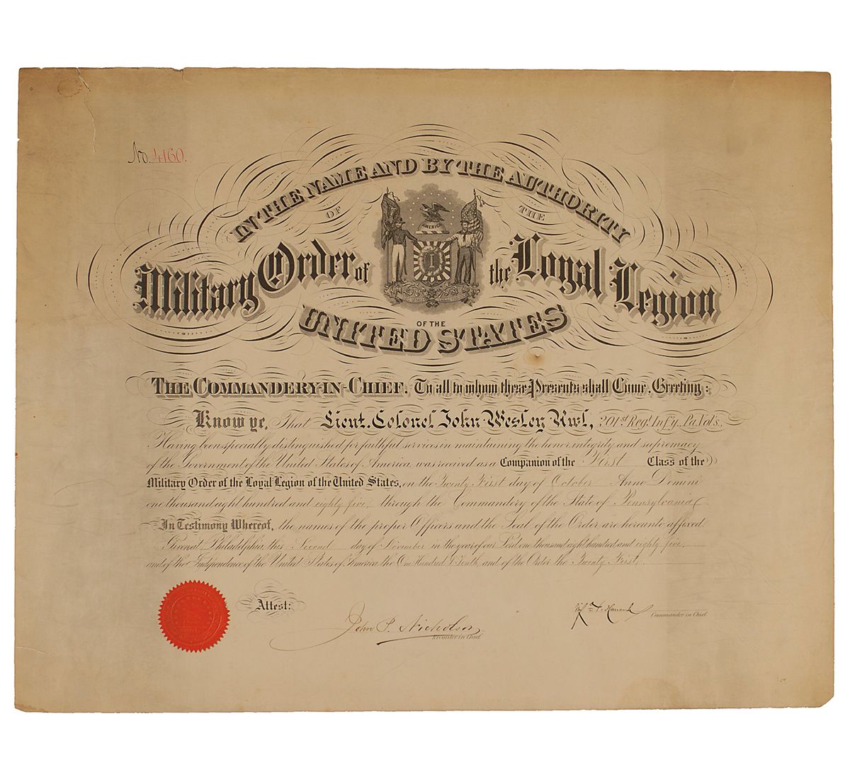 Union general (1824–1886) who distinguished himself in the Battle of Gettysburg and later commanded Custer and the 7th Cavalry against the Cheyenne in the disastrous 1867 campaign known as ‘Hancock’s War.’ Partly-printed DS, signed “Winf. S. Hancock,” one page, 24 x 19, November 2, 1885. Military Order of the Loyal Legion of the United States certificate issued to Lieutnenat Colonel John Wesley Pinel “as a Companion of the First Class.” Signed at the conclusion by Hancock, and countersigned by John P. Nicholson. Scattered creases and wrinkles, a couple of edge tears, uniform toning, and some scattered light soiling, otherwise very good condition. Rolled.
