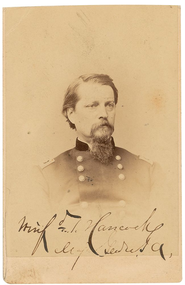 Union general (1824–1886) who distinguished himself in the Battle of Gettysburg and later commanded Custer and the 7th Cavalry against the Cheyenne in the disastrous 1867 campaign known as ‘Hancock’s War.’ Original 2.5 x 3.75 carte-de-visite bust portrait of Hancock in uniform, by F. Gutekunst of Philadelphia, signed at the bottom of the image in black ink, “Winfd. S. Hancock, Major Gen. USA.” In very good condition, with a couple light creases to the corners, light scattered soiling, and a trimmed top edge.