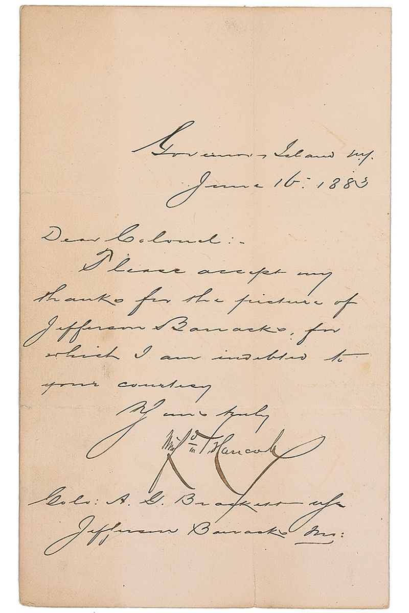 ALS signed “Winf’d S. Hancock,” one page, 5 x 8, June 16, 1880. Letter to Colonel Albert Gallatin Brackett. In full: “Please accept my thanks for the picture of Jefferson Barracks, for which I am indebted to your country.” Intersecting folds (one vertical fold passing through a single letter of the signature) and a light band of toning to the left edge, otherwise fine condition.