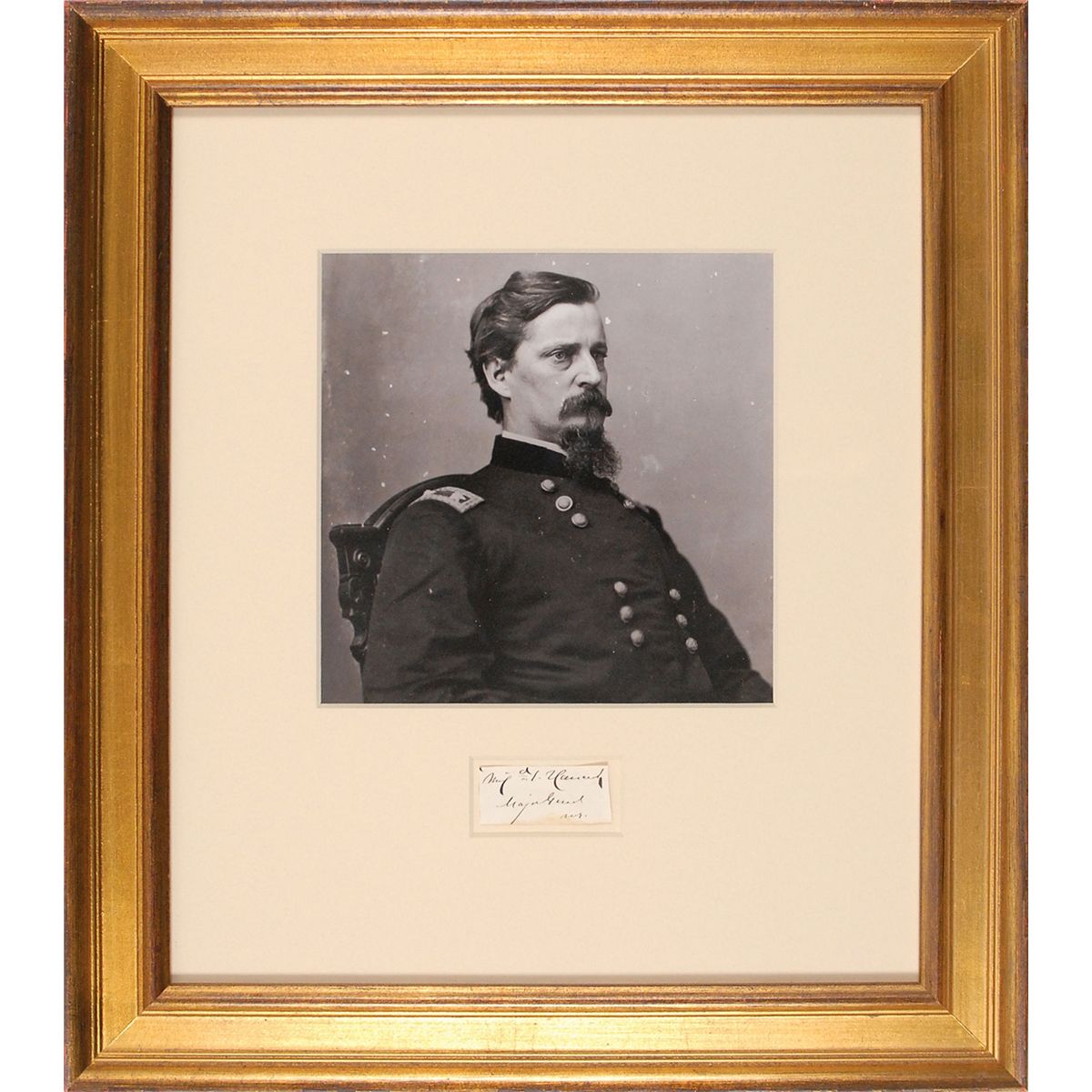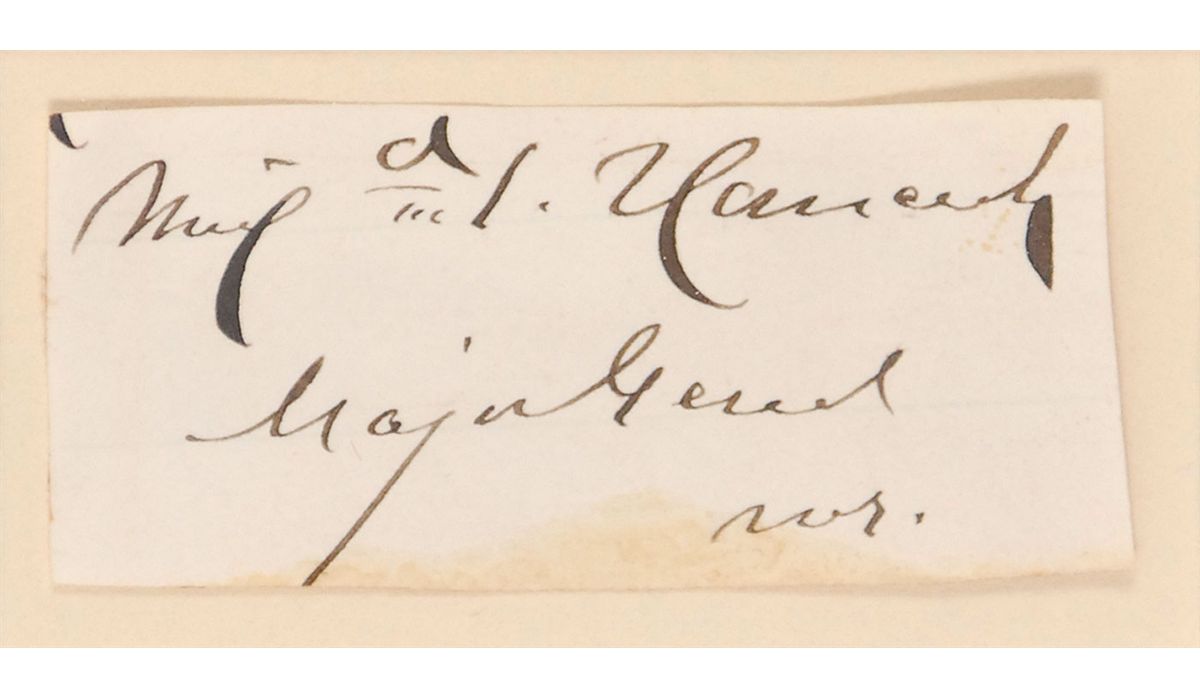 Union general (1824–1886) who distinguished himself in the Battle of Gettysburg and later commanded Custer and the 7th Cavalry against the Cheyenne in 1867. Ink signature, “Winf’d S. Hancock, Major General,” on an off-white 2 x 1 slip. Attractively matted and framed with a portrait to an overall size of 14.75 x 16.75. In fine condition, with light toning to bottom edge.