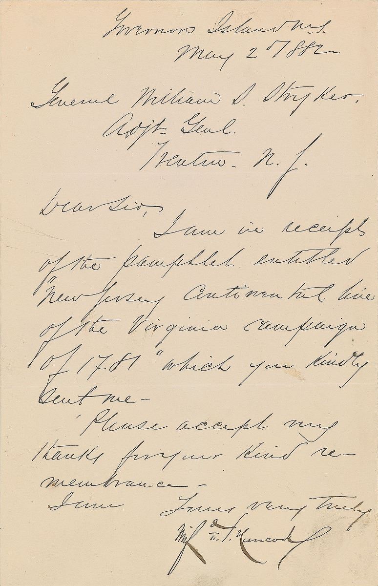 LS signed “Winf’d S. Hancock,” one page, 5.5 x 8.5, May 2, 1882. Letter to General William Stryker. In part: “I am in receipt of the pamphlet entitled ‘New Jersey Continental Line of the Virginia Campaign of 1781’ which you kindly sent me.” In fine condition. A desirable military association between the American Revolution and Civil War.