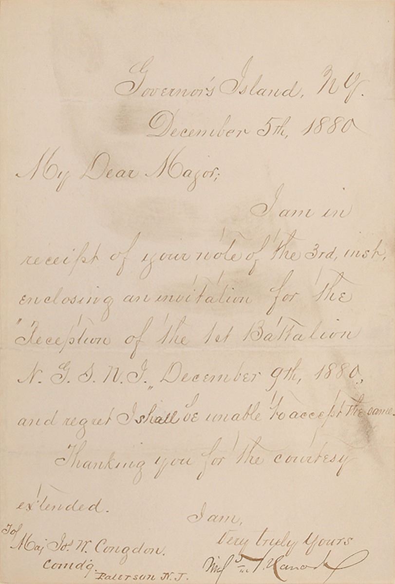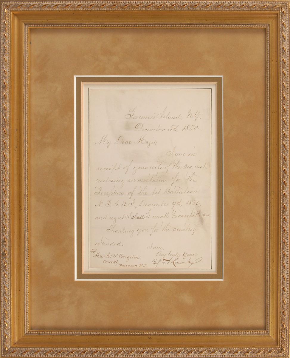 LS signed “Winf’d S. Hancock,” one page, 4.75 x 7, December 5, 1880. Letter declining an invitation, in part: “I am in receipt of your note…enclosing an invitation to the Reception for the First Battalion…and regret I shall not be able to accept the same.” Nicely double-matted and framed to an overall size of 11.5 x 13.5. Affixed to a slightly larger sheet and in fine condition.