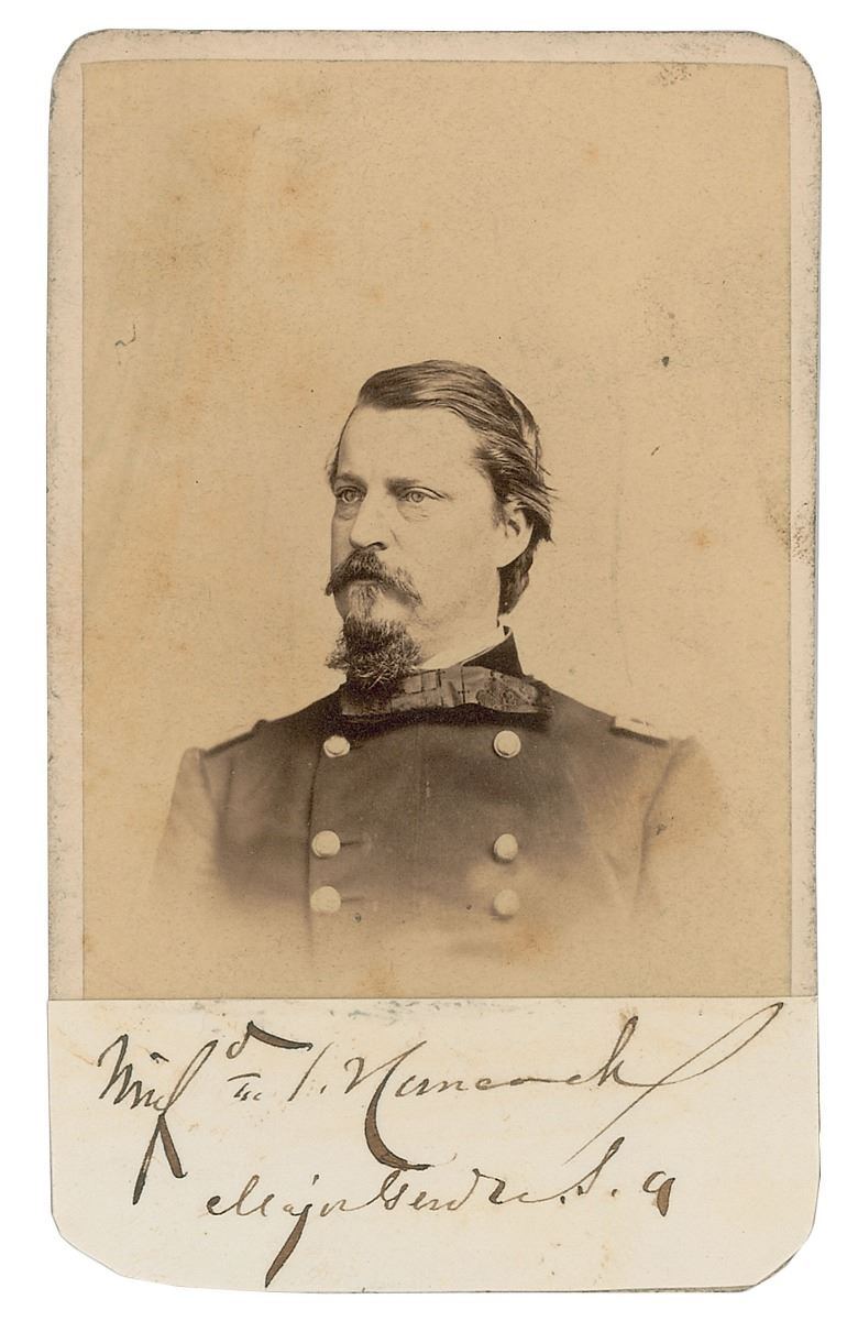 Ink signature, “Wnf’d S. Hancock, Major. Gen. U.S.A.,” on an off-white 2.5 x 1 slip affixed to the lower portion of a carte-de-visite portrait of Hancock in uniform, published by J. E. McClees. In very good to fine condition, with light soiling and trimmed (rounded) corners.