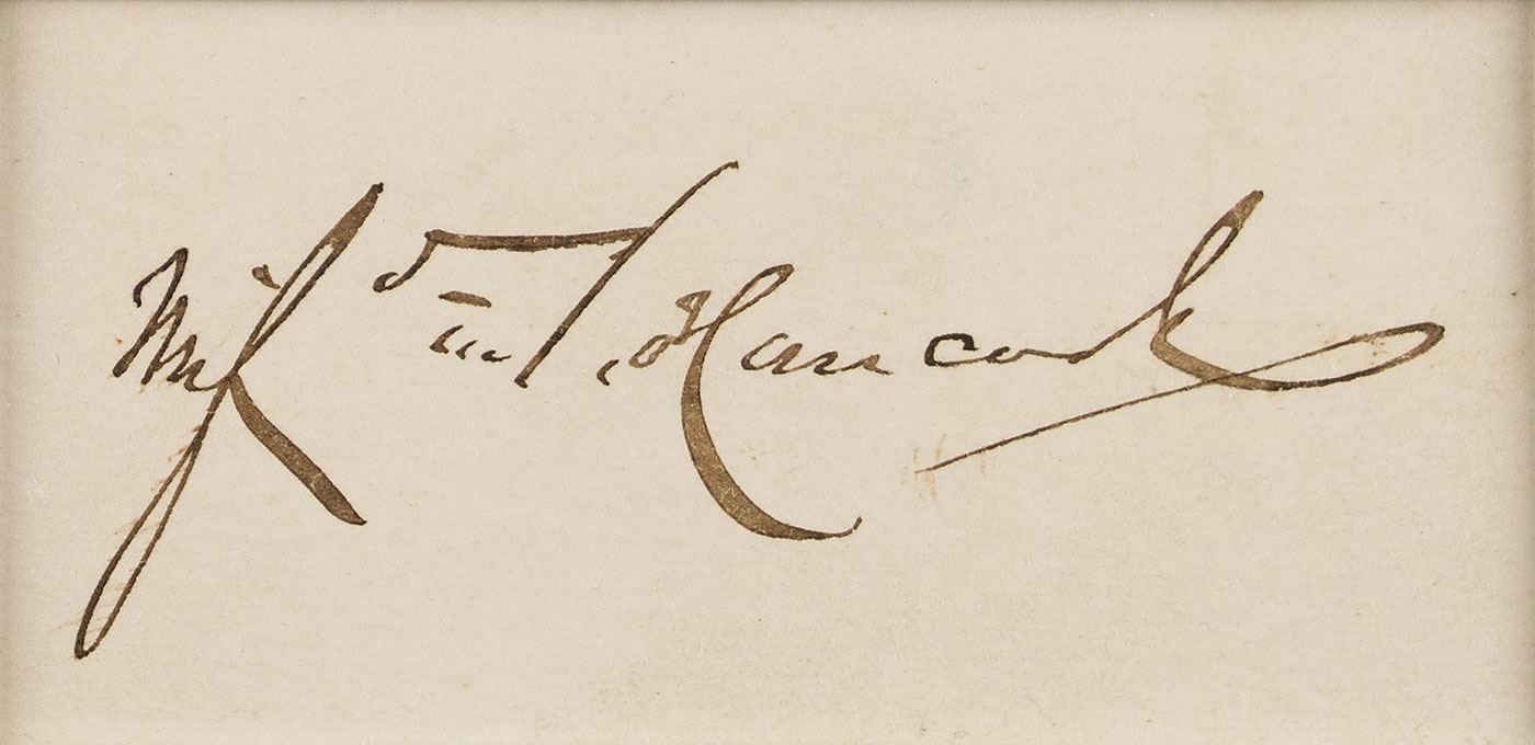 Ink signature, "Winf'd S. Hancock,” on an off-white 2.5 x 1.25 sheet. Matted and framed with a portrait to an overall size of 12.5 x 18.25. In fine condition.