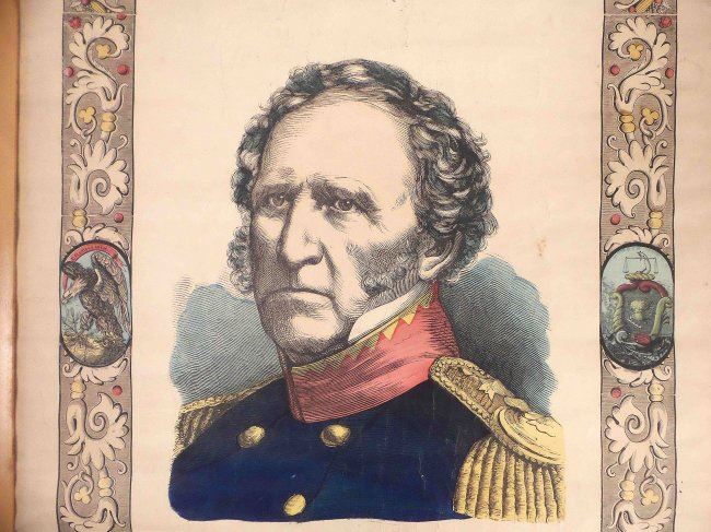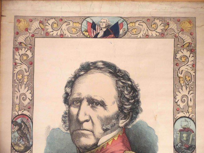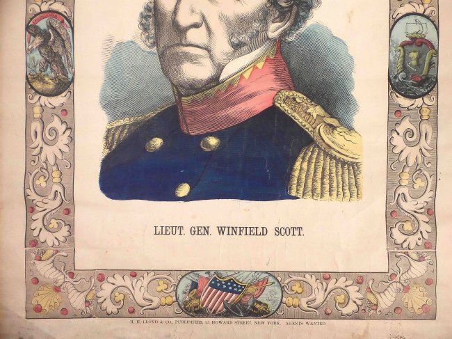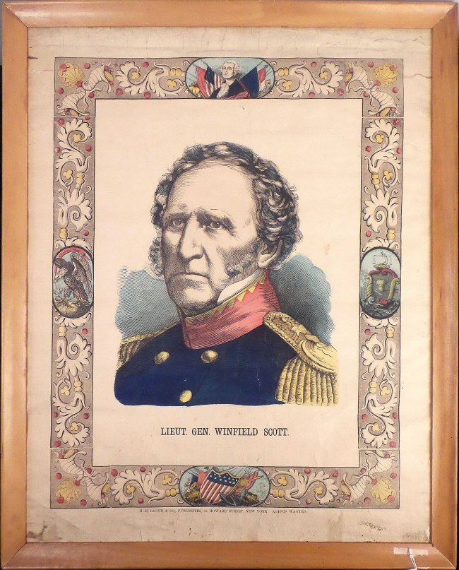 Hand-colored lithograph depicting General Scott in a bust-length, 3/4 profile, pose contained within a wide decorative surround with scrolling leafy elements and vignettes of historical Americana themes. Titled under below "Lieut. Gen. Winfield Scott." Published by "H. H. Lloyd & Co...." [Image: 20-1/2" H x 16" W on larger sheet] Contained under glass in a wood frame [25-3/4" H x 20-5/8" W]. Age-toning, water stains, and creases with short tears and separation.