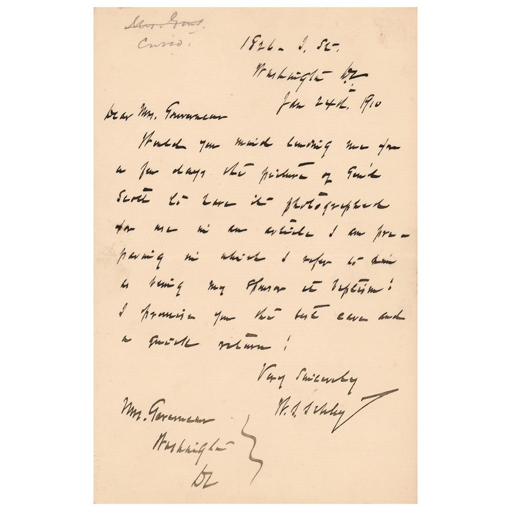 Naval officer (1839–1911) who commanded the destruction of the Spanish fleet at Santiago de Cuba and who led the expedition to rescue Adolphus Greeley in the arctic. ALS signed “W. S. Schley,†one page, 4.5 x 7, January 24, 1910. Handwritten letter referring to his namesake, in part: "Would you mind lending me for a few days the picture of Gen'l Scott to have it photographed for me in an article I am preparing in which I refer to him as being my sponsor at baptism!" In fine condition.